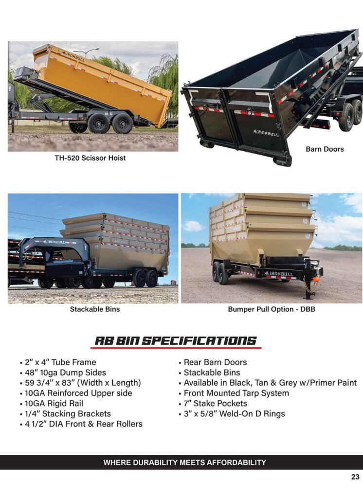 This is Iron Bull’s first-ever roll‑off dump trailer, engineered with the same toughness as their equipment and deckover lines. The Roll‑Off Deck option takes versatility further by turning your DBG14 into a multi‑use hauler for equipment, pallets, lumber, and more. Built with a reinforced steel frame, stake pockets, rub rails, and a durable wood floor, the roll‑off deck lets you move beyond just dumpster hauling while still maintaining the strength and reliability of an Iron Bull trailer. All DBG14 trailers are backed by the Iron Clad Warranty, giving you confidence in long‑term performance and support.