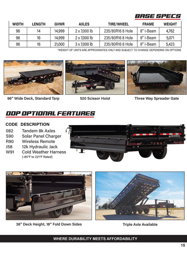 The Iron Bull DDP14 14,000 lb GVWR Tandem Axle Deckover Dump Trailer is one of the toughest, most versatile deckover dump trailers on the market, built in the USA for serious hauling in construction, landscaping, and agriculture. With a 96″ wide bed and 14’–16′ lengths, the DDP14 provides ample deck space and a raised deck design that accommodates rugged 10‑gauge, 18″ fold‑down sides for easy side‑loading of pallets, sod, mulch, gravel, and more. The tandem axle dump box delivers a GVWR range of 14,000–21,000 lb, giving you the payload capacity you need while keeping the trailer road‑ready and stable.