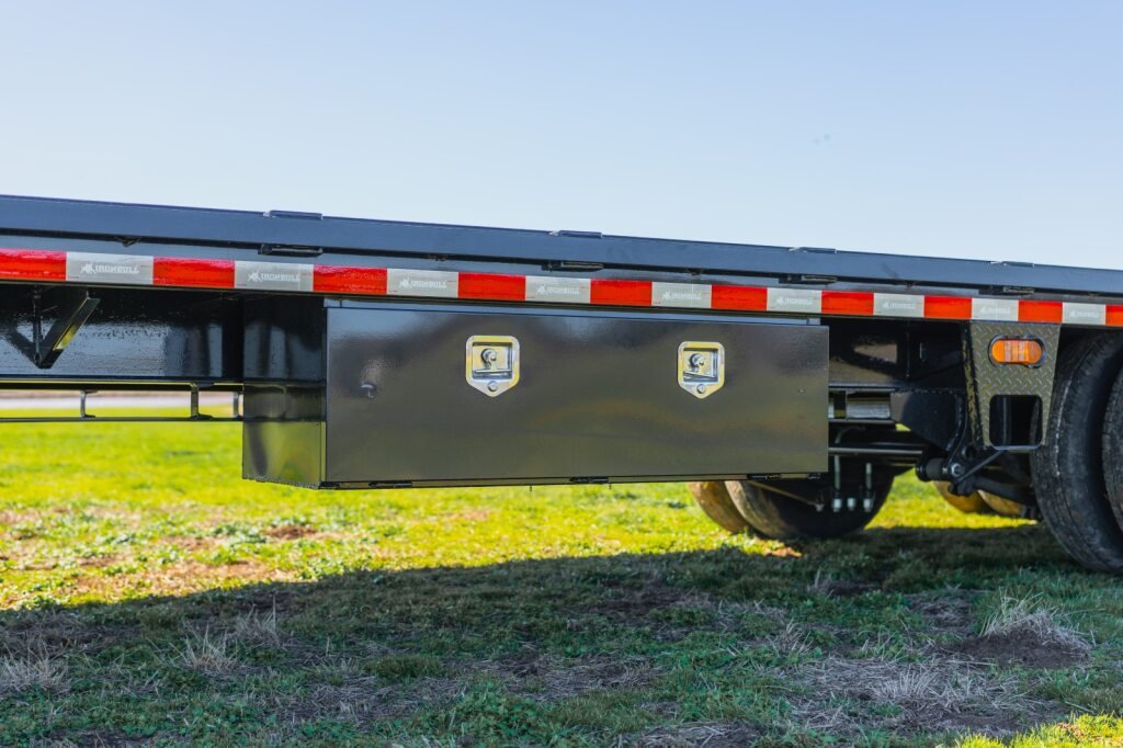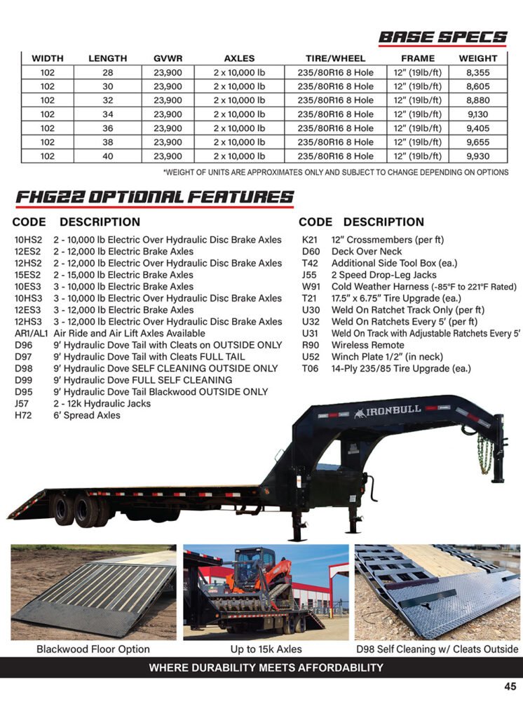 Practical features make the FHG indispensable: a standard locking toolbox at the front, two 16″ side steps for safe access, sealed wiring harness routed inside the 2″ x 6″ upper deck frame, and a fresh powder coat finish for long-lasting corrosion resistance and showroom appeal. Every trailer includes USA-made lifetime recessed LED lights from TecNic, stake pockets, pipe spools, rub rails, and an adjustable coupler for seamless gooseneck hitch compatibility. Whether you’re hauling construction gear, farm implements, or landscaping equipment, the Iron Bull FHG delivers the reliability, stability, and performance pros demand to conquer any job site.