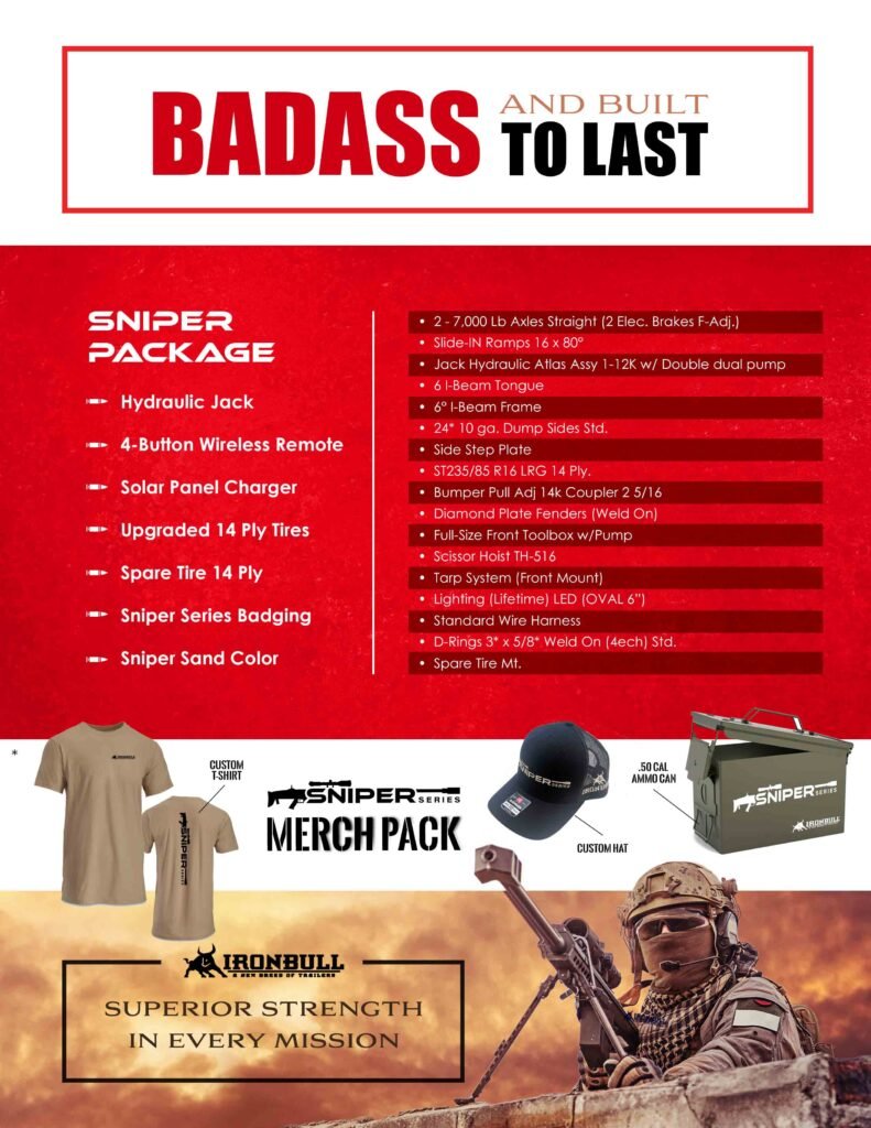 Equipped with a standard 7‑way wire harness, four heavy‑duty weld‑on D‑rings, a side step plate, and a built‑in spare tire mount, the Iron Bull DTB 14 Sniper Series is ready for tough jobs in tough conditions. Whether you’re hauling gravel, equipment, or building materials, this trailer combines power, reliability, and tactical style into one high‑performance dump trailer.