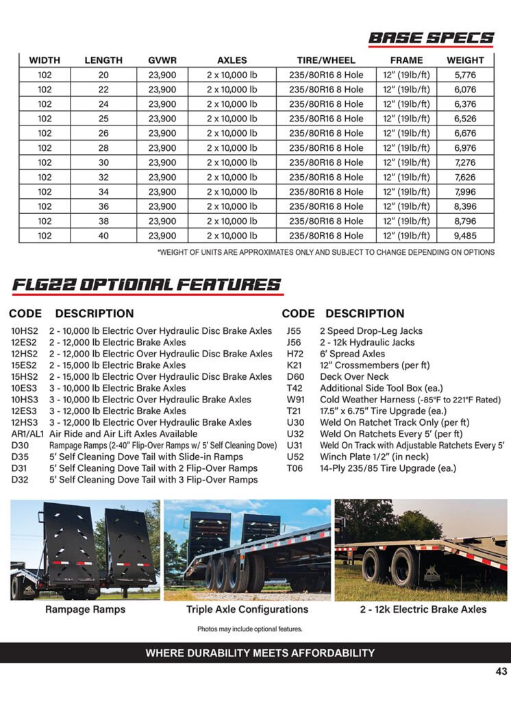 32′ – 10,000 lb electric brakes 32′ – 12,000 lb electric‑over‑hydraulic disc brakes 14″ x 22 lb engineered beam frame